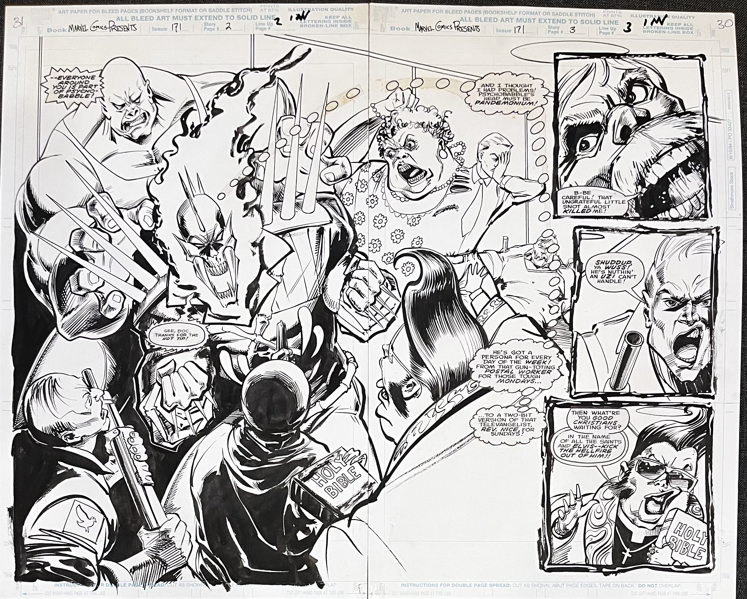 Artist: Reggie Jones, Fred Harper 1967-Ghost Rider surrounded by psycho odd balls Medium: Pen and Ink Date: 1995Signed: Publication: Marvel Comics Presents #171Support: 17x21.25”Image: 16x20”$1500
